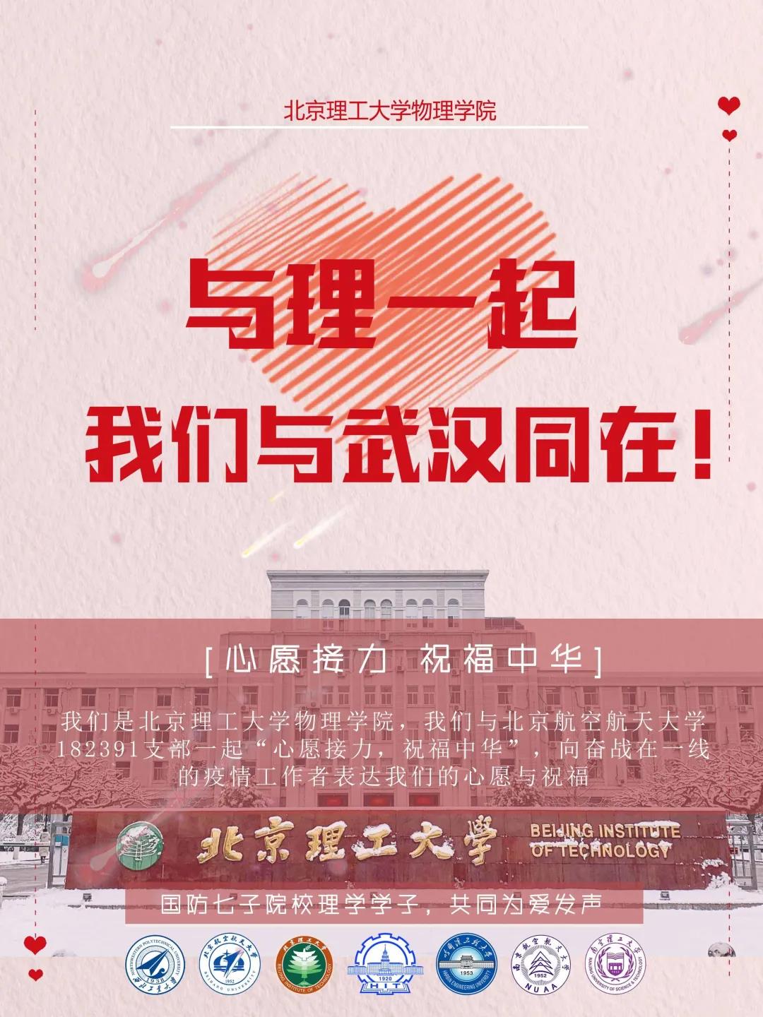 这个假期,新型冠状病毒感染的肺炎疫情牵动着每个人的心,战“疫”就此打响。白衣天使逆行而上,湖北人民坚守阵地,中华民族众志成城。在这个特殊的春天里,北理工物院学子响应“国防七子”发起的“心愿接力、祝福中华”的号召,用自己的方式向奋斗在战“疫”一线的工作人员致以崇高的敬意和美好的祝福。