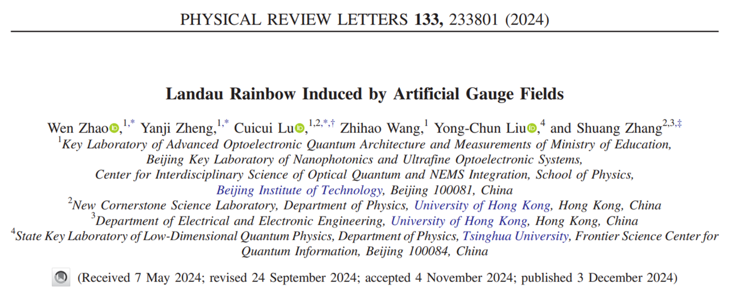 The ability to generate Landau levels using a pseudomagnetic field (PMF), also called an artificial gauge field, opens up new pathways for exploring fundamental physics and developing novel applications based on topological protection. In this Letter, we simultaneously realize a PMF and a pseudoelectric field (PEF) on a photonic crystal platform and observe a rainbow effect of the Landau zeroth modes. While a PMF induces a series of discretized Landau levels of photons in a similar way as the quantum Hall effect for electrons, a PEF breaks the degeneracy of the flat band of Landau levels over a broad range. Thus, different frequencies of the Landau modes can be dispersed into different spatial positions, leading us to term this phenomenon the “Landau rainbow.” The Landau rainbow, induced by the joint action of PMFs and PEFs, features robustness, broadband capability, and scalability, and may find applications in areas such as slow-light effect, multifrequency divider, and optical information multiplexing.