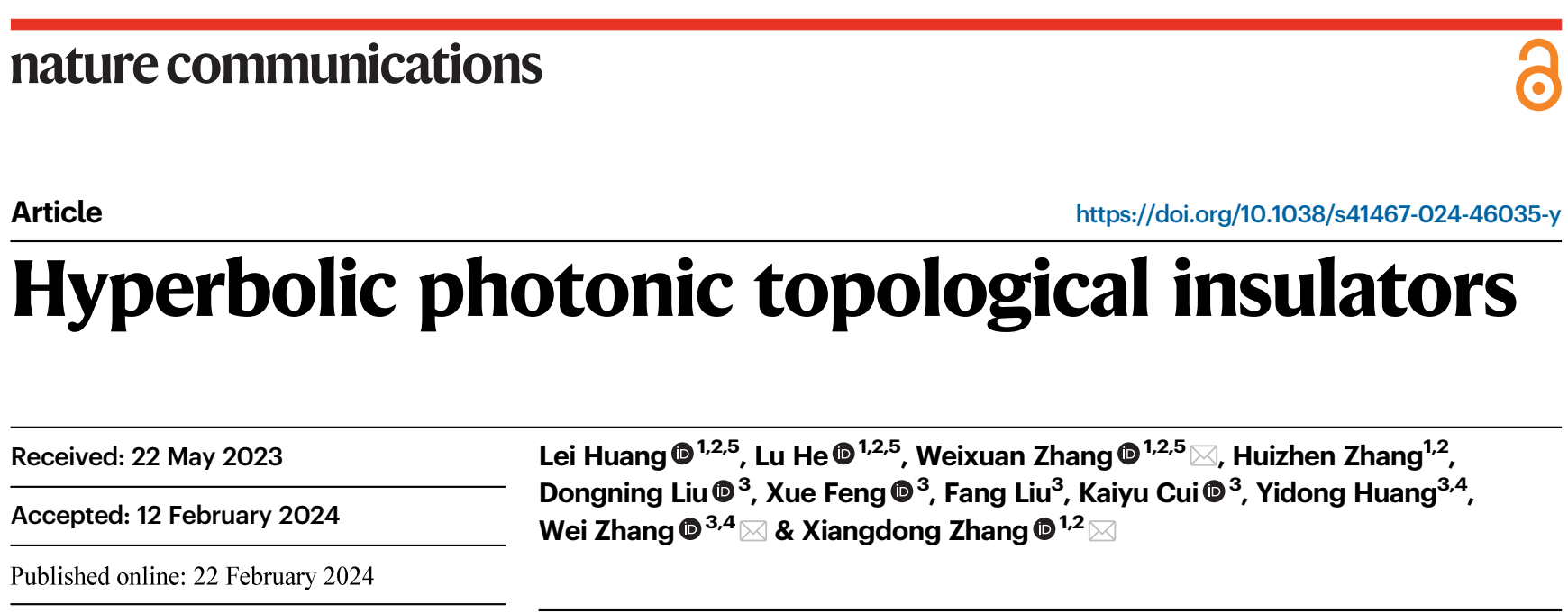 来源: 作者: 发布时间:2024-02-26Topological photonics provides a new degree of freedom to robustly control electromagnetic fields. To date, most of established topological states in photonics have been employed in Euclidean space. Motivated by unique properties of hyperbolic lattices, which are regular tessellations in nonEuclidean space with a constant negative curvature, the boundary-dominated hyperbolic topological states have been proposed. However, limited by highly crowded boundary resonators and complicated site couplings, the hyperbolic topological insulator has only been experimentally constructed in electric circuits. How to achieve hyperbolic photonic topological insulators is still an open question. Here, we report the experimental realization of hyperbolic photonic topological insulators using coupled ring resonators on silicon chips. Boundary-dominated one-way edge states with pseudospin-dependent propagation directions have been observed. Furthermore, the robustness of edge states in hyperbolic photonic topological insulators is also verified. Our findings have potential applications in the field of designing high-efficient topological photonic devices with enhanced boundary responses.