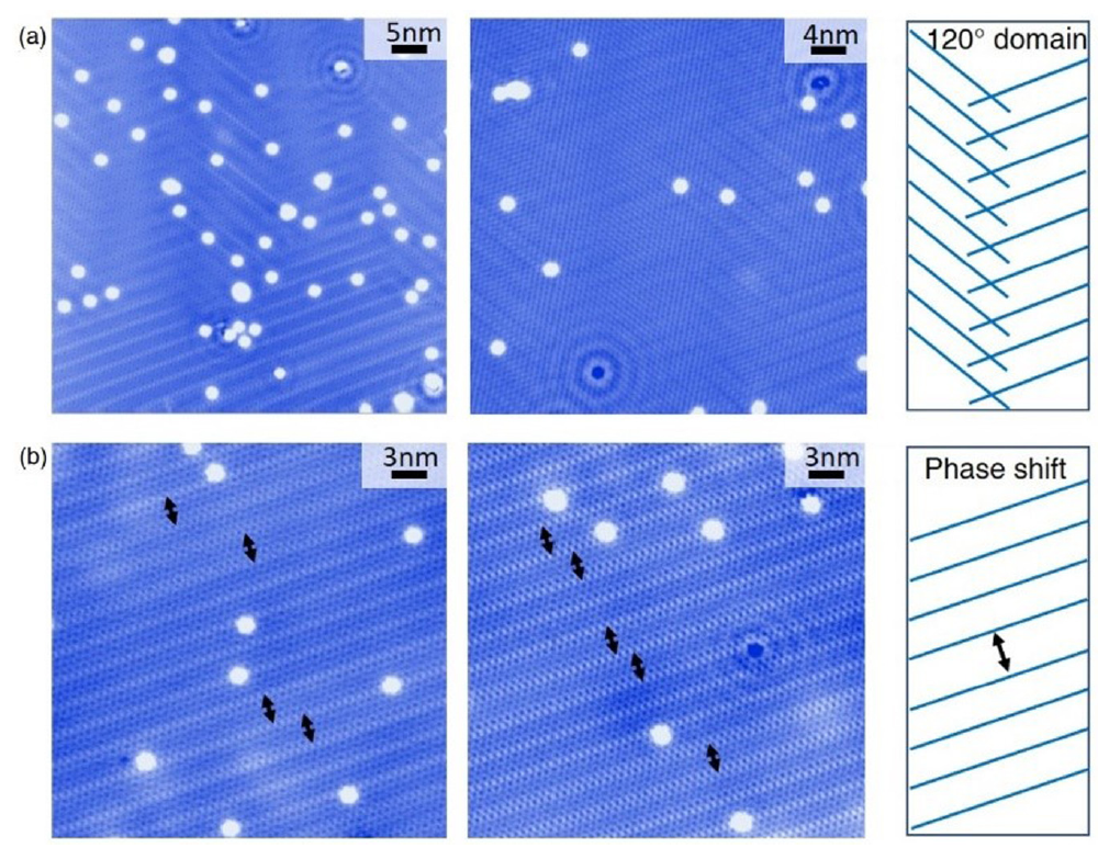 The synthesis of high-quality single crystal samples is the prerequisite for carrying out relevant experimental research. Dr. Yongkai Li (now is a postdoc in the same group), under the supervision of Prof. Zhiwei Wang, obtained a high-quality CsV3Sb5 single crystal sample after a series of optimization of crystal growth. The full width at half maximum (FWHM) of single crystal is only 0.07°. Electrical transport and magnetic property measurements show that this material has a CDW phase transition around 91K and a superconducting transition around 3 K, as well as an obvious anomalous Hall signal is also observed, as shown in Fig 1. The phenomenon of chiral charge order was discovered by low-temperature STM measurement, and two modulation structures of 2 × 2 and 1 × 4 were observed by cooperation with Prof. M. Z. Hasan’s group from the Princeton University, as shown in Fig 2. The 2 × 2 charge modulation structure is closely related to the CDW in this system, and the amplitude of the energy gap opened by the charge order exhibits real-space modulation characteristics with 2 × 2 chirality, which reflects the chiral charge order. However, the 1×4 modulation structure forms different domain walls, and there is a fixed angle of 120° between the domain walls, as shown in Fig 3. This work was published in PRB [Phys. Rev. B 104, 075148 (2021)] and was selected as an Editors’ Suggestion.