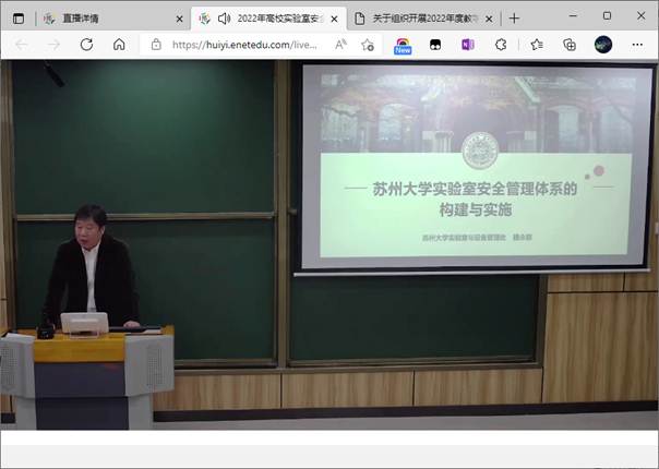 为确保常态化疫情防控中高校实验室安全运行,保障广大师生人身安全和校园隐定,落实全国高等学校实验室安全工作会议精神和《教育部办公厅关于组织开展2022年高等学校实验室安全检查工作的通知》文件部署,按学校要求,4月19日上午9点,学院组织实验室主管领导及实验室成员参加了教育部科学技术与信息化司、高等教育司召开的2022年高校实验室安全培训会。会上听取了清华大学实验室管理处副处长艾德生对《高等学校实验室安全检查项目表(2022年)》中责任体系、规章制度、安全检查 、实验场所等12项条目内容及修订要点的解读和苏州大学实验室与设备管理处处长魏永前对苏州大学实验室安全管理体系构建与实施的创新做法和取得成效的介绍,学习了中国矿业大学安全科学与应急管理研究院院长李爽讲授的双重预防机制在实验室安全管理中的应用及双重预防管理信息系统的建设。