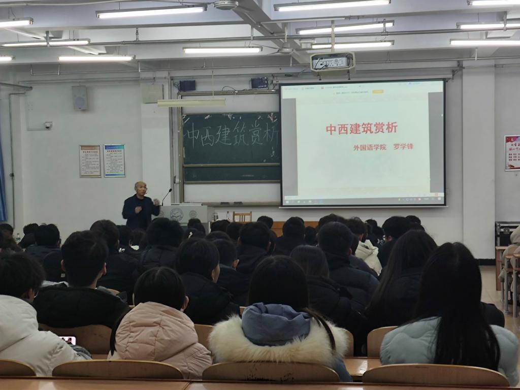 为了让同学们能以英语为工具和学习目标,将建筑知识和英语语言有机融合,ky开元集团官网12月7日特邀外国语学院教授罗学锋做《中西建筑鉴赏》讲座。
