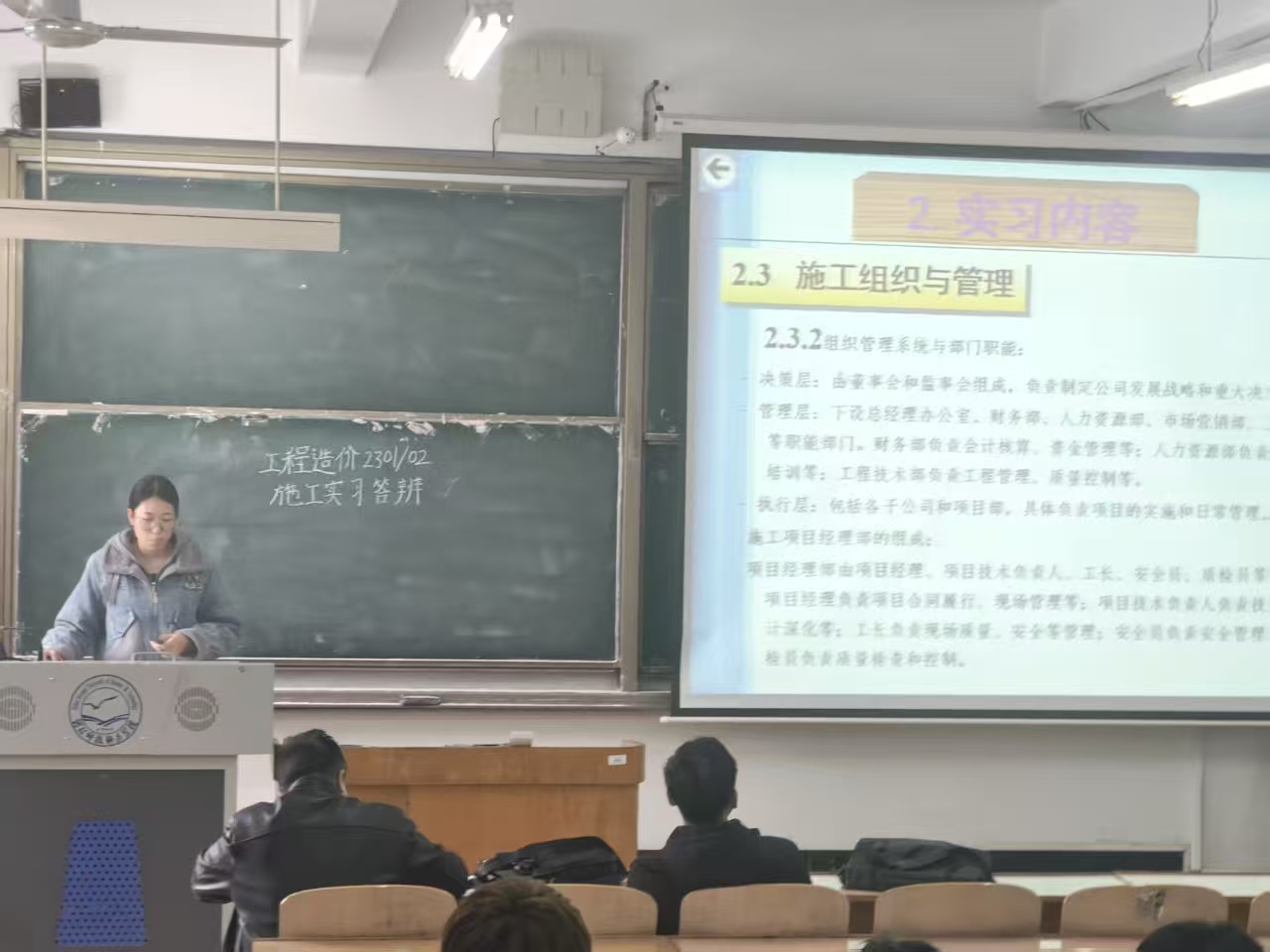 本次交流会以实习成果分享与答辩为核心环节,要求每位学生准备图文结合的PPT答辩文档,重点展示实习期间对建筑结构、施工流程、成本数据收集等专业内容的深入理解。活动全面检验了学生们在实习过程中对人工、材料、机械台班等基础数据的现场采集能力,以及对施工阶段工程造价全过程的认识程度。交流现场,同学们分享了各自在实习中的收获与感悟,展现了扎实的专业素养和实践能力。