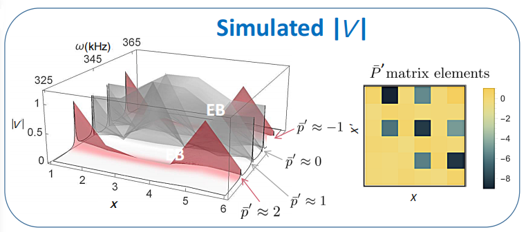 在图2中,研究人员展示了具体的电路仿真结果。其中左图为电压分布结果,它的x,y和z三个坐标轴分别代表电路的6个节点,频率范围以及电压分布。研究人员根据谐振频率下的电压分布图可以直接读出奇异束缚态特性。从图中结果可以看出,高电压主要分布在4个频率上。这4个频率即为我们奇异束缚态系统的4个本征值,他们相应的电压即为本征态。进一步,研究人员还通过阻抗矩阵还原了奇异束缚态系统的哈密顿量。它的矩阵元分布如右图所示,研究人员发现它与晶格模型的哈密顿量基本一致。因此,研究人员完全可以基于电路系统去实验实现奇异束缚态。