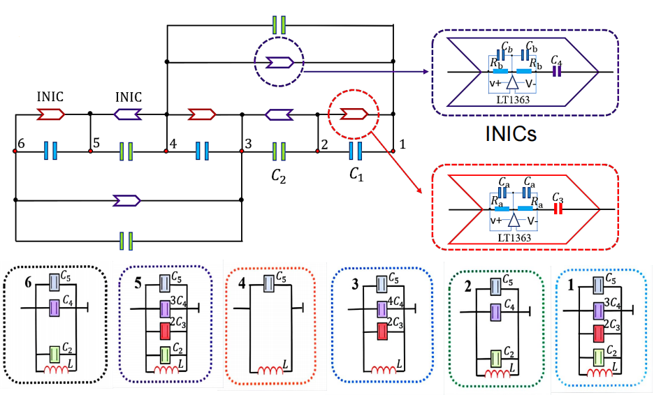首先,研究人员基于量子薛定谔方程与电路基尔霍夫方程数学形式上的一致性,将奇异束缚态的晶格模型引入到电路模型中。他们的方案示意图如图1所示。该电路包含6个节点(标记1-6),每个节点间通过电容和负阻抗转换器(INIC)连接。INIC的具体结构如右上侧虚线框所示,它提供了电路中的非互易耦合连接。另外,每个节点都应连接相应的接地元件以保证在位能。这样的一个电路网络能够与量子晶格模型之间存在良好的对应关系。通过输入电压并测量共振频率分布,研究人员就可以等效得到奇异束缚态的本征值和本征态等信息。