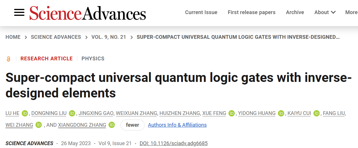 日前,必赢bwin官方网站张向东教授课题组与清华大学电子工程系黄翊东教授课题组张巍教授开展合作,基于反设计方法,实验实现了目前世界上最小的光量子逻辑门。相关成果以“Super-compact universal quantum logic gates with inverse-designed elements”为题发表在Science Advances期刊[Science Advances, 9, adg6685]上。该工作得到了国家自然科学基金委和国家重点研发计划的大力支持。必赢bwin官方网站博士生何路、清华大学电子工程系博士生刘东宁为该论文的共同第一作者,必赢bwin官方网站张向东教授、清华大学电子工程系张巍教授为论文共同通讯作者。另外,必赢bwin官方网站张慧珍副研究员、张蔚暄研究员;清华大学刘仿教授、冯雪副教授、崔开宇副教授、学生高景行也对此工作做出了贡献。