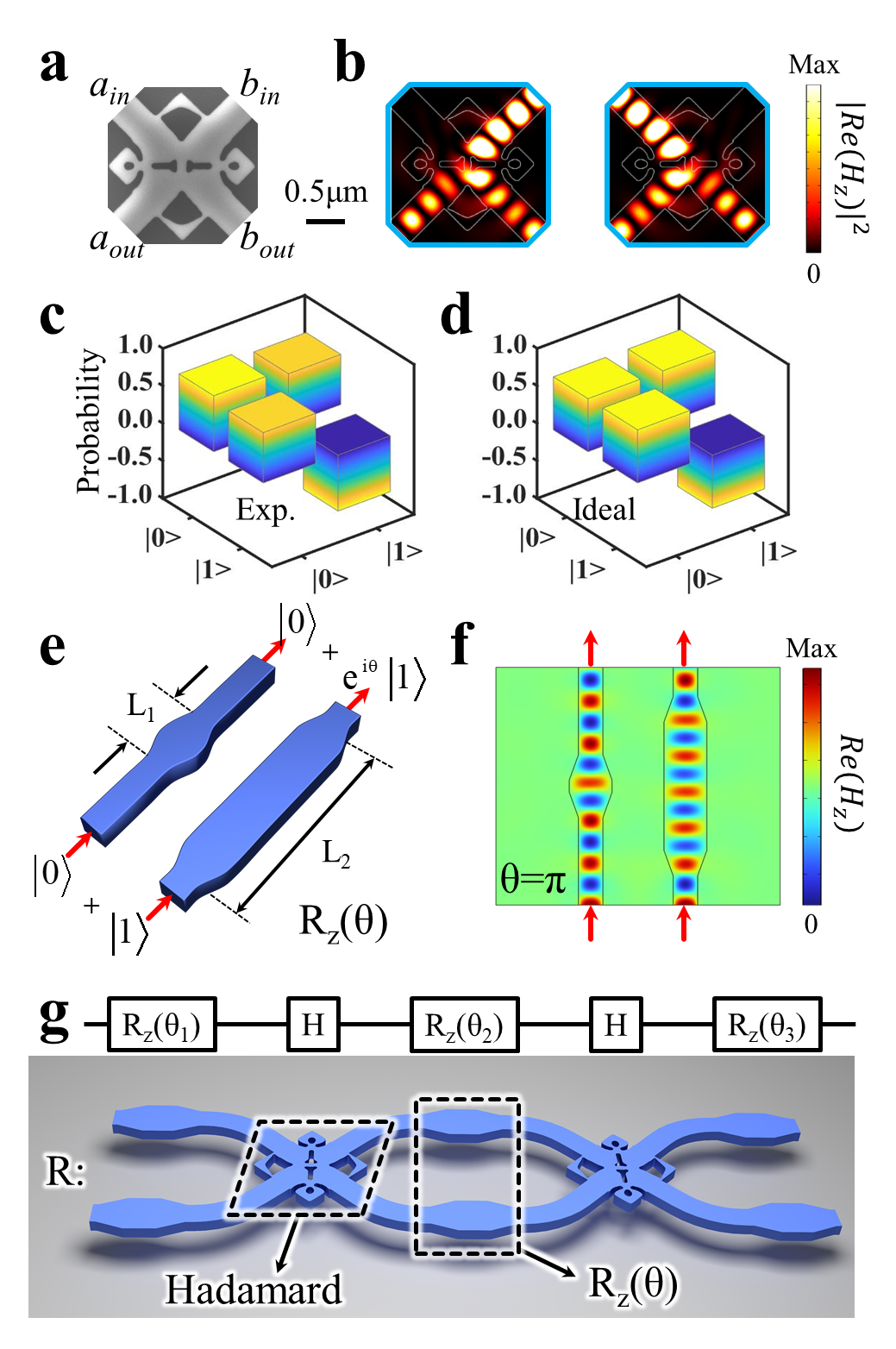 基于这样的Hadamard门,结合相位旋转z门Rz(θ),研究人员构建了任意的单比特量子门R。对于路径编码方案,研究人员通过在光量子态的两条路径之间引入相位差轻松实现Rz(θ)门。如图2e所示,相位z门是由宽度为700nm、长度为L1和L2的加宽波导构成的。当L1≠L2时,在这些波导中的量子态