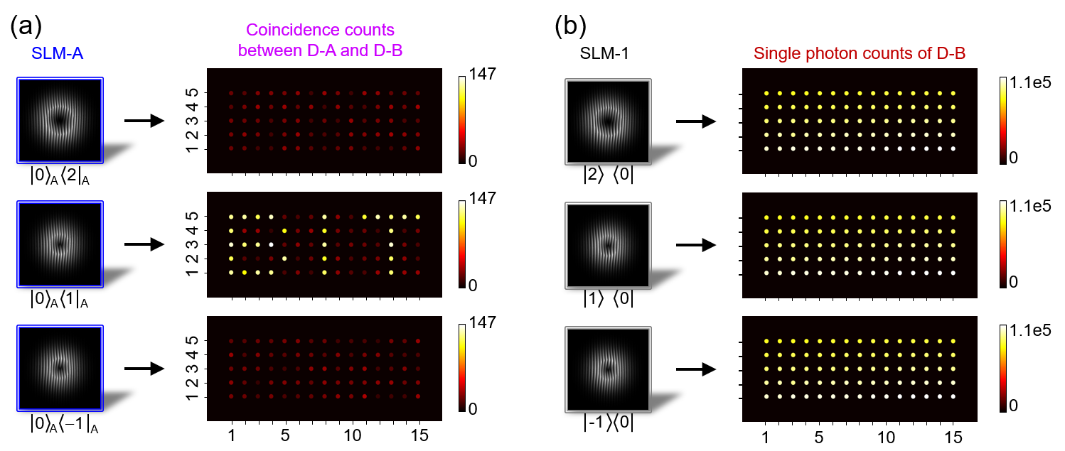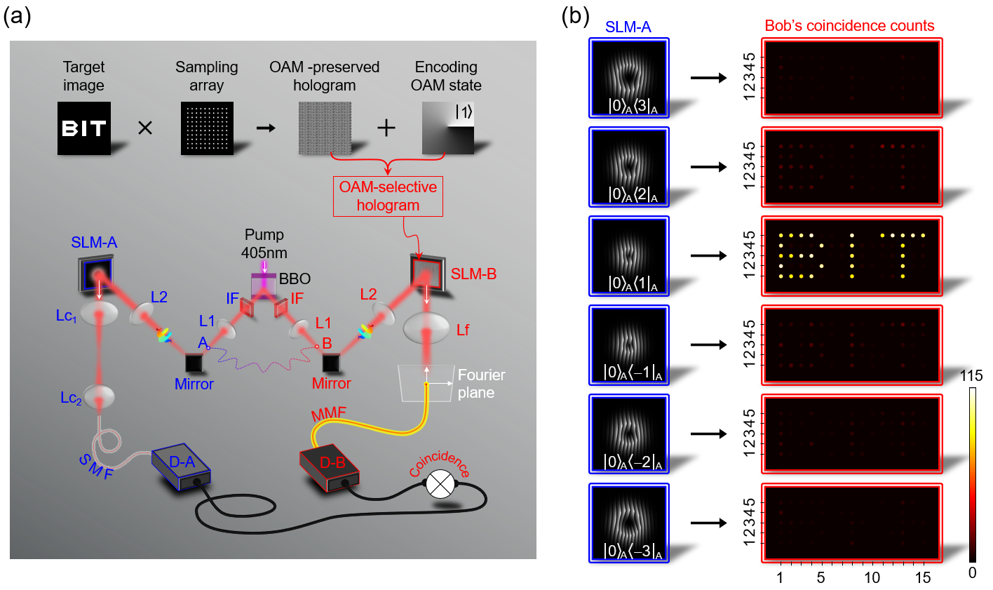 图1. 高维轨道角动量纠缠量子全息方案示意图(a)及其测量结果(b)。
