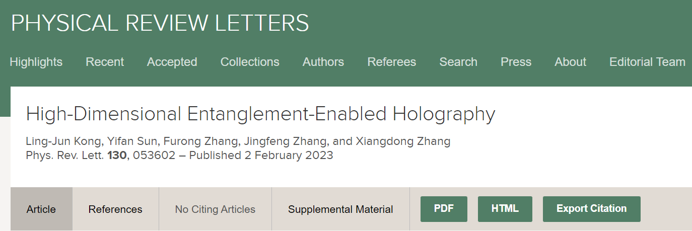 近日,必赢bwin官方网站张向东教授课题组基于高维轨道角动量纠缠态,实现了高维量子全息和图像安全加密。相关成果以“High-dimensional entanglement-enabled holography”为题发表在国际物理学顶级学术期刊《物理评论快报》[Phys. Rev. Lett. 130, 053602 (2023)]上。必赢bwin官方网站孔令军研究员、孙亦凡副研究员为该论文的共同第一作者,必赢bwin官方网站张向东教授为论文通讯作者,必赢bwin官方网站张福荣博士、张景风博士也为该工作做出了重要贡献。该研究工作得到了国家自然科学基金委的大力支持。