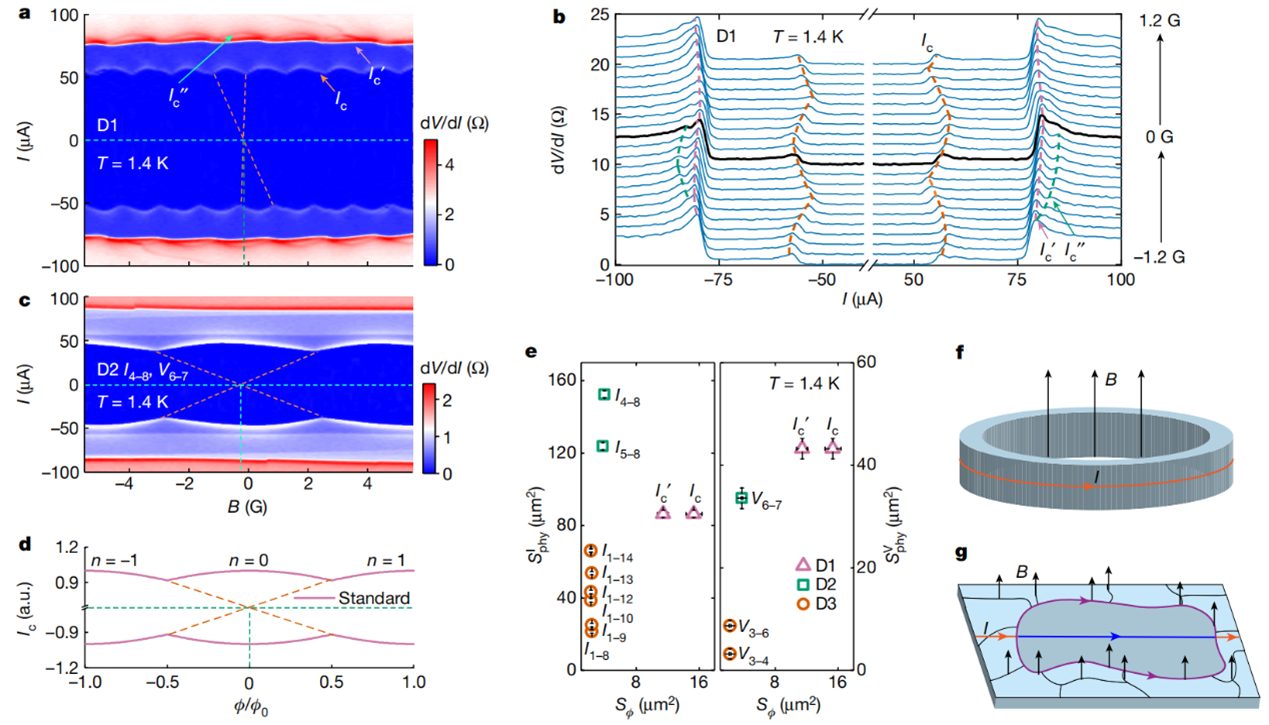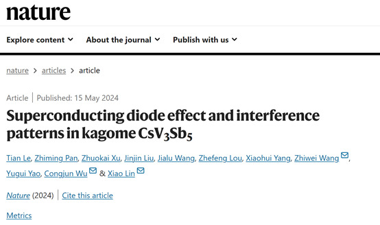 2024年5月15日,必赢bwin官方网站王秩伟教授、姚裕贵教授团队,与西湖大学林效教授、吴从军教授团队等人合作,在《自然》杂志上在线发表题为“Superconducting diode effect and interference patterns in kagome CsV3Sb5”的研究论文。首次在笼目晶格超导材料CsV3Sb5中观察到了零磁场超导二极管效应和超导干涉条纹,在一定程度上证明了CsV3Sb5中超导态具有时间反演对称性破缺的特征。