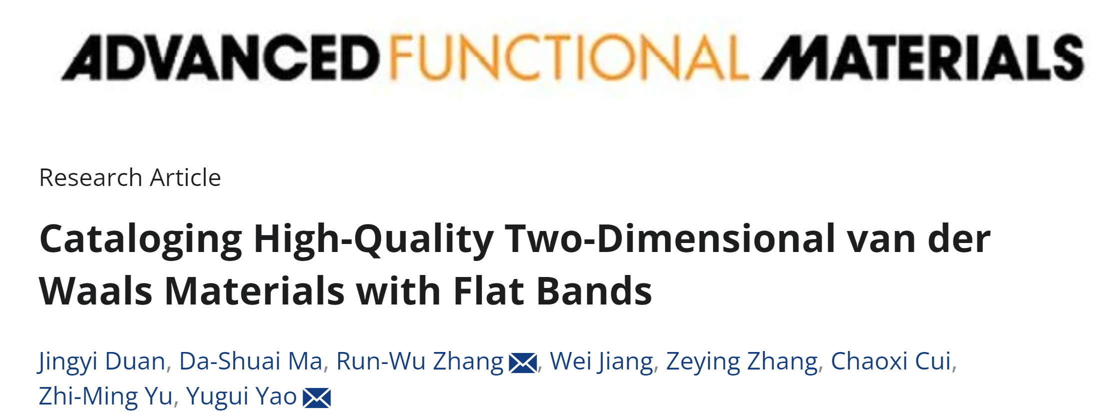 该工作得到国家自然科学基金委、科技部、必赢bwin官方网站青年教师学术启动计划等单位的支持。必赢bwin官方网站博士生段璟奕、马大帅博士(2021届博士毕业生,现供职于重庆大学)为该工作的共同第一作者,张闰午副教授、姚裕贵教授为共同通讯作者。另外,必赢bwin官方网站余智明教授、蒋伟教授、张泽英副教授(2019届博士毕业生,现供职于北京化工大学)、博士生崔朝喜也对此工作做出了贡献。相关结果发表于国际顶级期刊Advanced Functional Materials (IF: 19.0):Jingyi Duan,† Da-Shuai Ma,† Run-Wu Zhang*, Wei Jiang, Zeying Zhang, Chaoxi Cui, Zhi-Ming Yu, and Yugui Yao*; “Cataloging High-Quality Two-Dimensional van der Waals Materials with Flat Bands”, Advanced Functional Materials, 2313067 (2024). (†为共同一作;*为共同通讯作者。)
