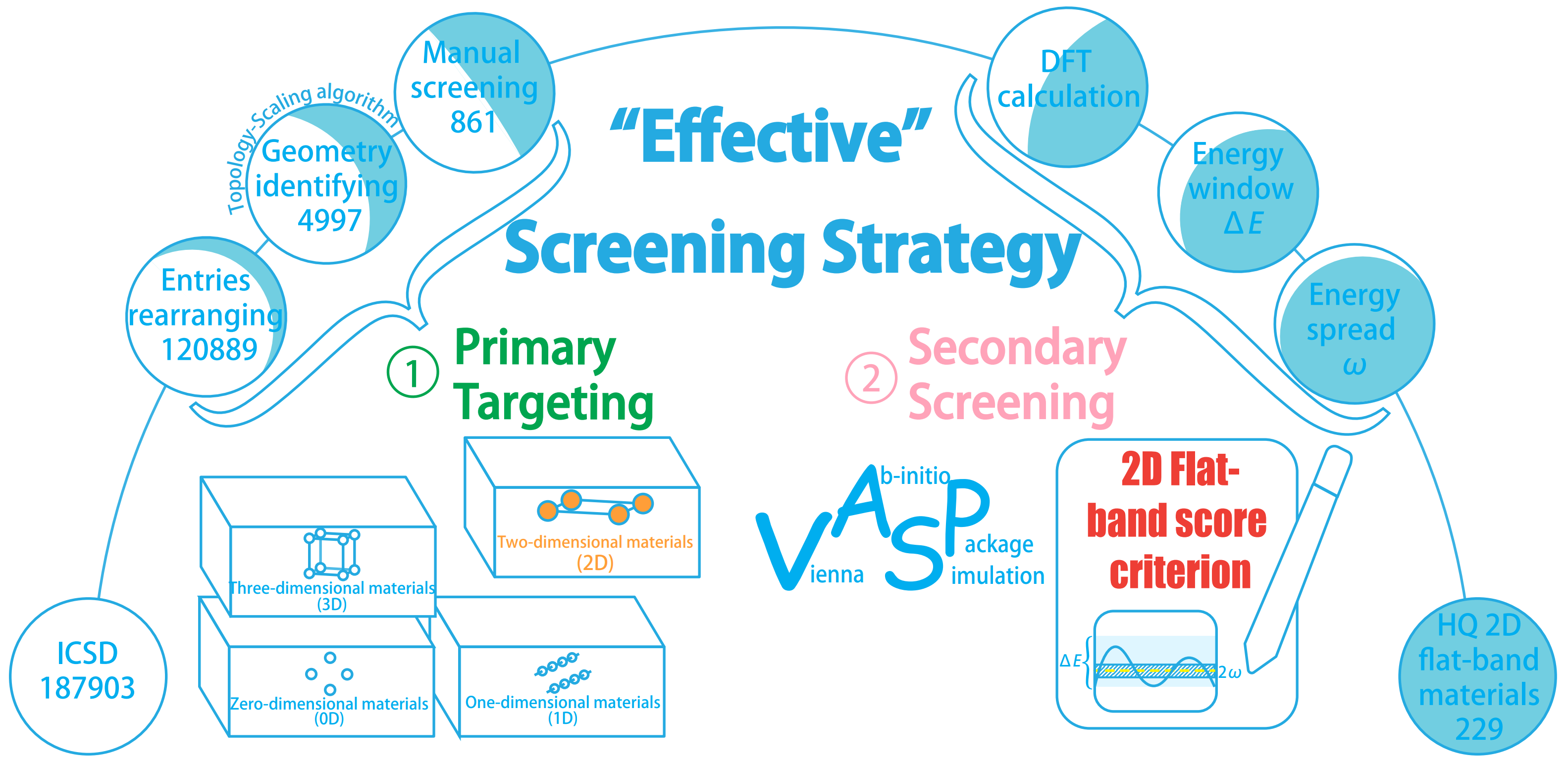 图1 筛选二维范德华平带材料的流程图。该筛选流程可以识别平带的特征,并通过“初级靶向”和“二级筛选”两层筛选框架来构建高质量平带材料目录。