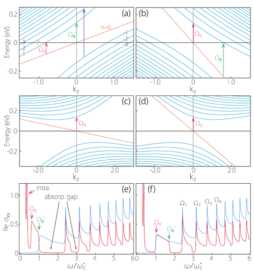 磁场下,电子的运动将会量子化而形成朗道能级,如体系是三维的,则朗道能级在沿着磁场方向是有色散的。研究发现,在第二类外尔半金属中,能量倾斜会使得体系的朗道能级间距变小,特别是当磁场指向偏移能量倾斜方向为某个临界角度时,朗道能级的间距为零,也即导致所谓的朗道能级坍塌现象(collapse of Landau levels)。基于半经典的物理图像,他们还指出了此坍塌现象对应于电子在磁场中的回旋运动轨道由闭合变为开放,表明此时有效外尔模型已不足以描述电子的行为。在朗道能级坍塌之前,第二类外尔点的朗道能级的磁光电导亦表现出与传统外尔材料的迥异行为:如具有各向异性的磁光电导,低频下一直存在带间跃迁,且随频率增加,光学吸收谱具有独特的形状等。这些发现皆有助于指导实验发现第二类外尔费米子材料和确定体系参数。