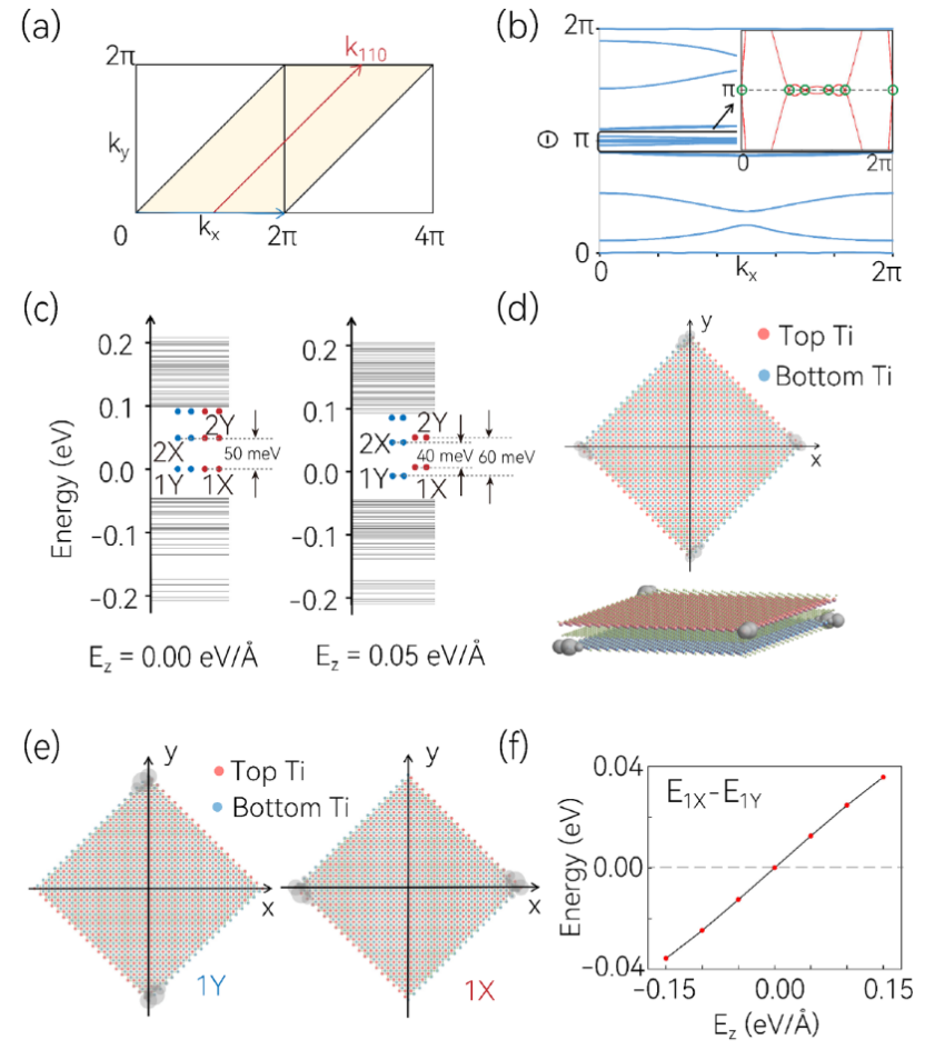 图2. (a-b)单层TiSiCO沿红色路径计算的Wilson loop。(c)单层TiSiCO纳米盘在不同电场下的能级。(d)Ez = 0 时最低一组角态的实空间电荷密度分布。(e)Ez = 0.05 eV/Å 时1X和1Y角态的实空间电荷密度分布。(f)1X与1Y角态间的能量差随电场的变化。