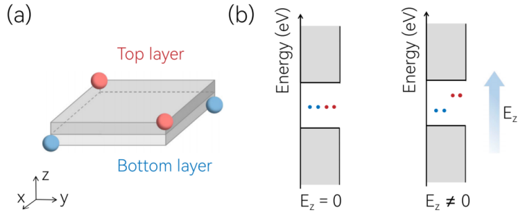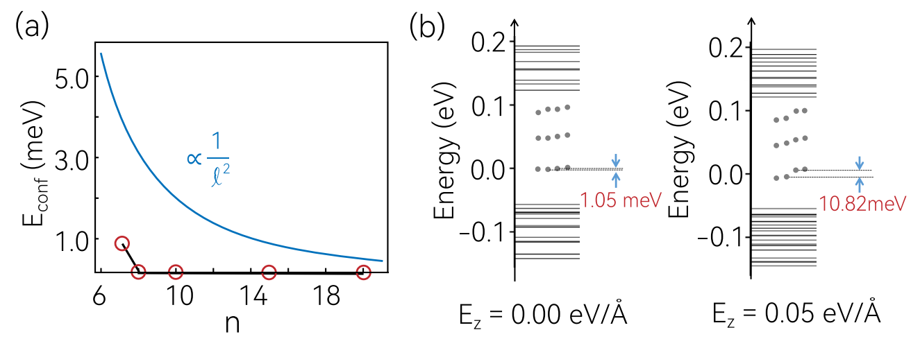 图4. (a) 单层TiSiCO纳米盘的限域能随体系尺寸变化。(b) n=7的单层TiSiCO纳米盘在不同电场下的能级。