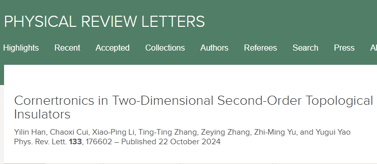 Yilin Han#, Chaoxi Cui#, Xiao-Ping Li, Ting-Ting Zhang, Zeying Zhang, Zhi-Ming Yu*, and Yugui Yao*; “Cornertronics in Two-Dimensional Second-Order Topological Insulators”, Physical Review Letters, 133, 176602 (2024).
