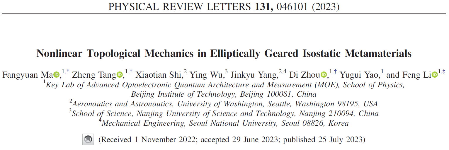 2023年7月25日,Physical Review Letters在线发表题为“Nonlinear Topological Mechanics in Elliptically Geared Isostatic Metamaterials”(非线性椭圆齿轮力学超材料)的科研论文。该研究由必赢bwin官方网站的姚裕贵教授、周迪副教授和李锋教授团队完成,必赢bwin官方网站的博士生马方垣和汤正为该论文的共同第一作者。必赢bwin官方网站是该研究的第一单位。