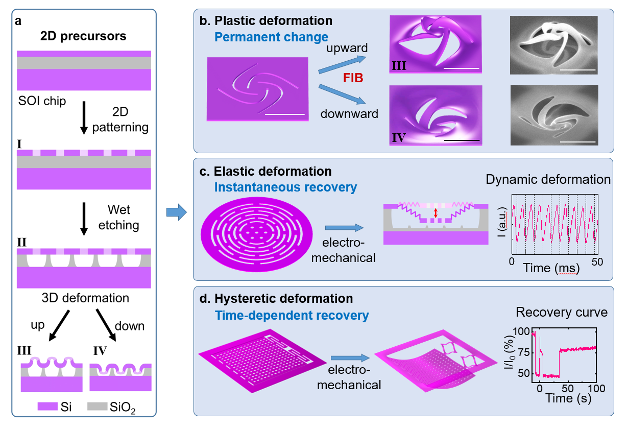 图1. 硅基纳米剪纸结构形变调控。(a) 基于绝缘体上硅(SOI)衬底的纳米剪纸结构微纳制造流程。(b) 聚焦离子束(FIB)辐照诱导的双向塑性形变。(c) 机械力或静电力作用下可瞬时恢复的弹性形变。(d) 电压驱动下的滞性形变。比例尺:1µm。