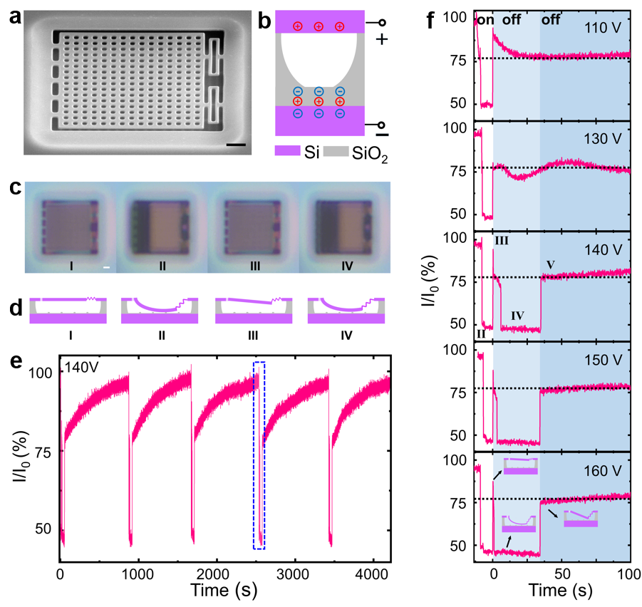 在塑性形变方面,研究团队提出基于镓离子注入与硅空位诱导的非对称分布及饱和效应等新机理,突破了传统两段式形变理论的局限,首次实现了具有双反转特征的三段式塑性形变,揭示了剂量依赖的合成力矩对结构形变方向的决定性作用,为深入理解硅材料的塑性形变机制奠定了重要理论基础。在可逆弹性形变方面,研究团队基于机械力或静电力驱动机制,设计了一种高弹性的网状纳米弹簧结构,可实现低至10 nN的力学响应(图3)。在滞性形变方面,研究团队设计了一种平面弹簧结构,首次观察到静电力驱动下的反常滞后形变现象,即断电后近乎复原的二维平面结构自发形变至三维状态的现象(图4)。