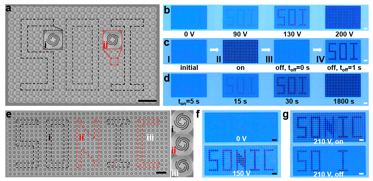硅基纳米剪纸结构精确可控的弹性及滞后形变模式,为动态光学信息编码和加密显示提供了新的技术途径。为验证这一概念,研究团队设计了多种刚度不同的螺旋结构并进行编码,采用“幅值”、“时长”、“时序”多参量调控驱动电压,成功实现了多种模式的信息加密与光学显示(图5)。这种滞后效应与刚度设计的协同作用,为发展动态信息加密与光学显示技术提供了新策略。