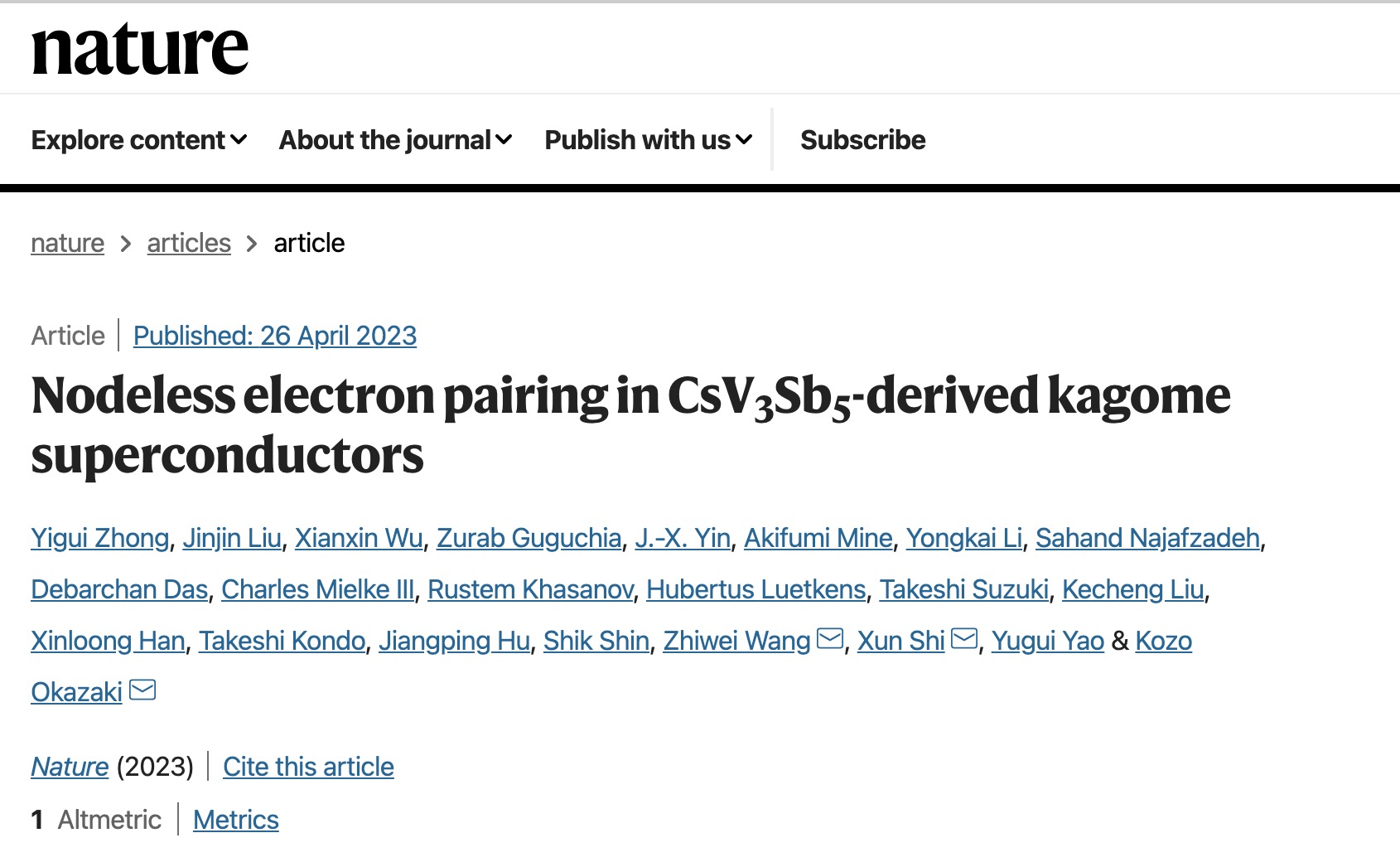 近日,必赢bwin官方网站姚裕贵教授、施训教授、王秩伟研究员团队,与东京大学钟益桂博士、Kozo Okazaki教授,中科院理论物理研究所吴贤新研究员,南方科技大学殷嘉鑫教授和瑞士保罗谢勒研究所Zurab Guguchia教授等人合作在《自然》杂志发表论文“Nodeless electron pairing in CsV3Sb5-derived kagome superconductors”,揭示了笼目超导体中稳健的无节点超导能隙,为研究其超导配对机理提供了关键实验依据。