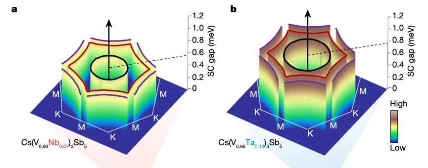 进一步地,研究人员通过细致的化学替换,将部分钒原子可控地替换为同族更大的铌或钽原子,从而精确调控超导序和电荷密度波序(图2)。通过对相图中有无电荷密度波序的区域进行比对研究,发现超导能隙均显示为无节点和各向同性(图3)。如此稳健的能隙结构极大缩窄了超导配对对称性的候选范围,同时结合缪子散射实验发现该超导态破坏时间反演对称性,指向了d+id波超导配对的可能性。