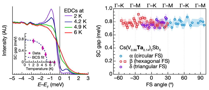 图1.Cs(V0.86Ta0.14)3Sb5超导能隙的高精度谱学特征(左)及其动量依赖关系(右)