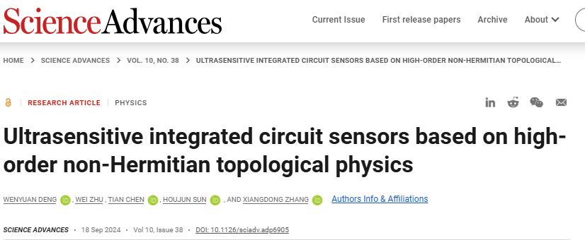 日前,必赢bwin官方网站张向东教授课题组和集成电路与电子学院孙厚军教授课题组合作,理论提出并实验实现了目前世界上第一个高阶拓扑传感芯片。相关成果以“Ultra-sensitive integrated circuit sensors based on high-order non-Hermitian topological physics”为题发表在Science Advances期刊上。该工作得到了国家自然科学基金委和国家重点研发计划的大力支持。必赢bwin官方网站博士生邓闻远、集成电路与电子学院朱伟特聘研究员为该论文的共同第一作者,必赢bwin官方网站张向东教授、集成电路与电子学院孙厚军教授和朱伟特聘研究员为论文共同通讯作者。另外,必赢bwin官方网站陈天副教授也对此工作做出了贡献。