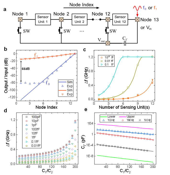 研究人员在图3中展示了所设计传感芯片的控制模块和具体性能参数,图3a中展现了基于FPGA技术实现的系统模块控制,可以通过控制测量端口所连接的开关SW实现系统在多种灵敏度模式的切换。通过研究人员的实验测试和标定,系统可以非常清晰地展现出指数级别的趋附效应(图3b),同时,该芯片可以精确测量容值为到