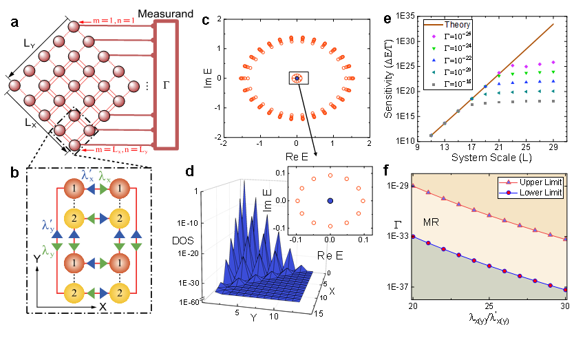 为了验证该理论方程的准确性,研究人员进行了相应的数值仿真与理论计算,相关数据展示在图1e和1f中。通过数值仿真和理论曲线的可以清晰看出,理论推导结果符合数值仿真结果,系统的灵敏度随着系统的尺度增大而增大。不同的是,在尺度增长到一定范围后,系统的灵敏度数值上会出现一定的饱和效应,如图1e所示。该饱和效应是由于待测物理量的数值过大,放大后的能量偏移具有上限,不代表系统的灵敏度会受到限制,所以在待测量无穷小时,系统的灵敏度会完全如理论方程式所示,随着系统尺度而指数增长。同时,图1f给出了系统的灵敏度随着系统耦合参数的变化情况,可以看到在一定的范围内通过调节系统的耦合参数,系统的灵敏度可以在小范围内精细调节,这种特性使该系统在应用层面有更多的可调性,可以适用于更多种复杂的应用场景。