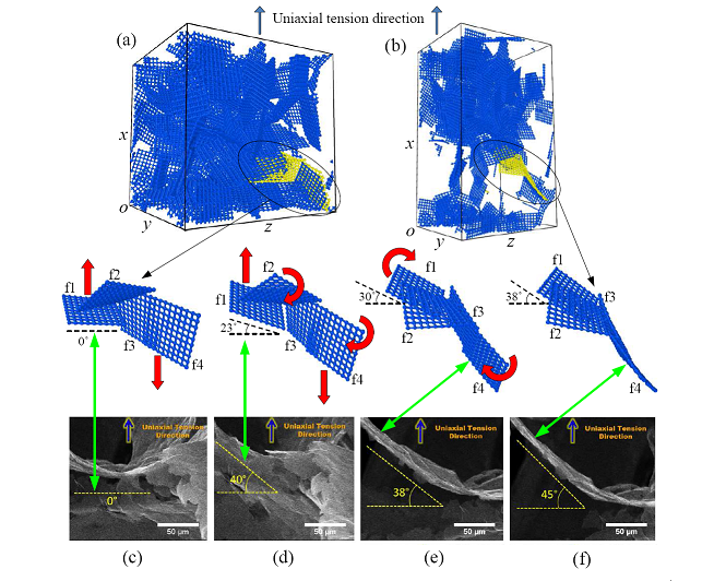 图1:拉伸条件下石墨烯泡沫的介观结构演化过程,以及与Arvind教授原位拉伸试验SEM图的对比情况