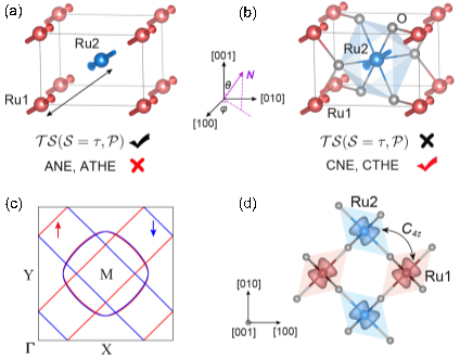 二氧化钌(RuO2)是一种典型的交错磁体(图1)。原胞内两个磁性Ru原子具有反平行的自旋磁矩,非磁性O原子围绕Ru原子形成八面体结构。若只考虑Ru原子,则存在PT和Tt对称操作(P:空间反演,T:时间反演,t:1/2晶格平移),能带为自旋二度简并;非磁性O原子可以破坏PT和Tt对称操作,使能带发生非相对论自旋劈裂。RuO2具有共线反平行磁序,净磁化强度为零,但其能带发生自旋劈裂。由于晶体中所有原子的参与,导致PT和Tt对称性被破坏,被称为“晶体”时间反演对称性破缺。在交错磁体RuO2中,已有理论和实验工作报道了晶体霍尔效应、晶体磁光效应和隧穿磁阻等新奇物性。