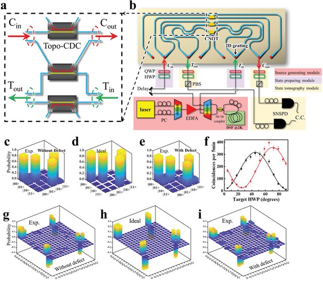 )。编码光子通过二维光栅注入到芯片中,二维光栅可以将自由空间中的偏振编码光子转换为芯片内的路径编码光子态。通过在topo-CDC中发生的两光子干涉实现CNOT功能。在这种情况下,输出量子比特可以通过包含HWP,QWP,偏振分束器(PBS)和光纤耦合的超导纳米线单光子探测器(SNSPD)的态层析模块进行测量。