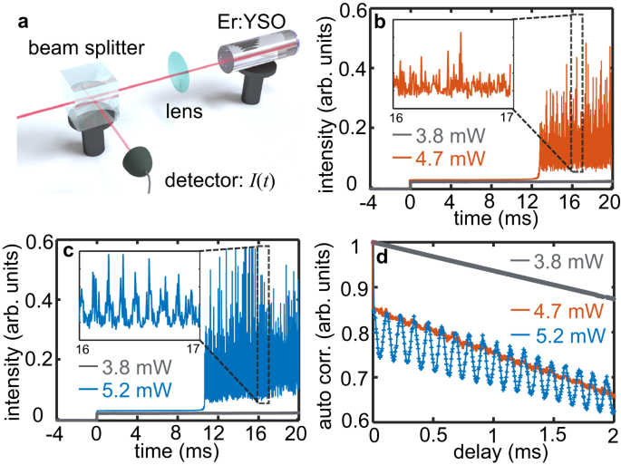 我们在实验上清晰地观察到了掺铒晶体材料的连续相变。在激光驱动较弱时,材料展现出一般光学材料的吸收效果。逐渐增加激光强度时,材料首先会发生自发的时间平移对称性破缺,然而这时体系的输出是杂乱无章的,其内部仍然没有建立起时间上稳定的周期性行为。当强度继续增加到某个临界值,系统就会展现出时间晶体的周期性振荡行为。由于受到原子多体相互作用的保护,这样的周期运动在很长时间范围内都会保持稳定,并且具有长程的时间关联性,其相干时间甚至超过了单个离子的相干时间。