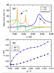 图4:破坏粒子--空穴对称性项使得等离激元能谱发生劈裂,形成双峰结构(P1 和P2)