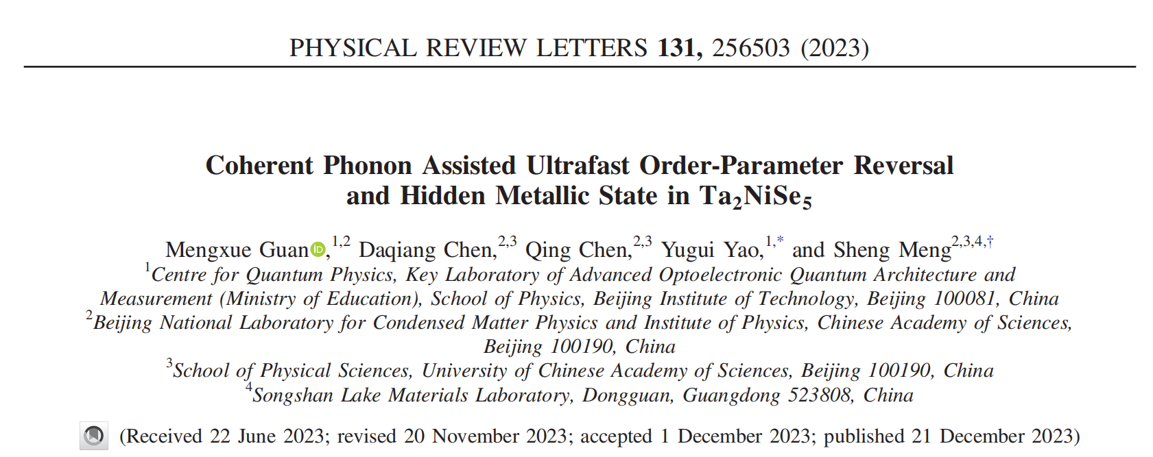 近期,必赢bwin官方网站姚裕贵、关梦雪特别研究员和中国科学院物理研究所的孟胜研究员团队展开合作,利用非绝热含时密度泛函分子动力学(TDDFT-MD)方法深入探究了Ta2NiSe5中的非平衡多体相互作用。研究明确了晶格序参量在光诱导绝缘体-金属转变过程中的关键作用,为理解关联量子材料中激子-声子动力学提供了全面的视角。相关研究题目为《Coherent Phonon Assisted Ultrafast Order-Parameter Reversal and Hidden Metallic State in Ta2NiSe5》,成果被发表在物理学领域的顶级期刊Physical Review Letters上。