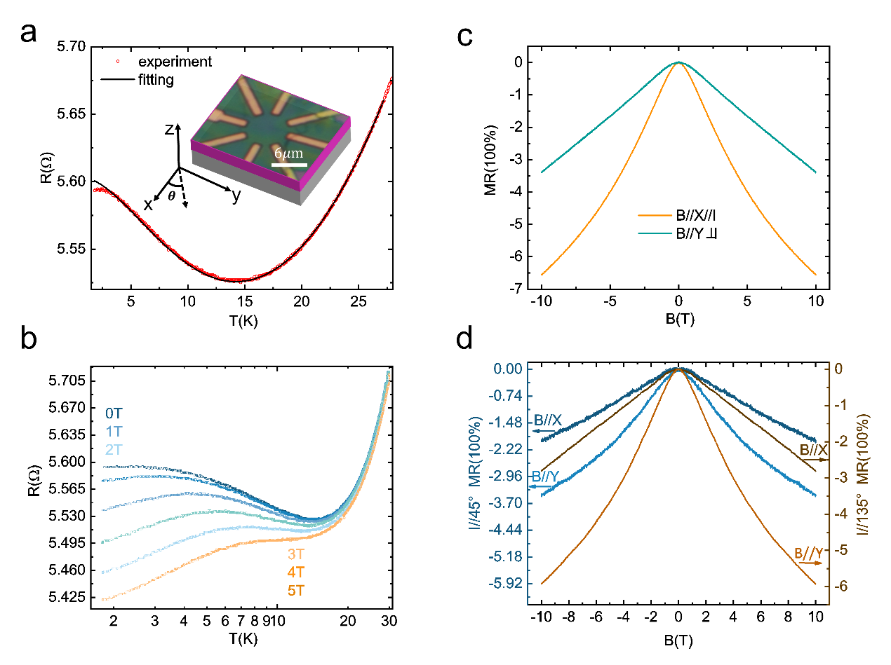 必赢bwin官方网站段俊熙副教授、姚裕贵教授团队长期致力于新型拓扑和量子材料的输运性质研究。为了实现这种异维近藤超晶格,研究团队选择了拥有丰富磁学性质的过渡金属二硫化物VS2- VS异维超晶格作为候选材料。该结构由必赢bwin官方网站的周家东教授最先合成[Nature 609, 46–51 (2022)]。研究中,我们发现:(1)在VS2- VS异维超晶格观察到了电阻关于温度的对数依赖关系以及负磁阻,即近藤效应的典型特征。有趣的是这两者对磁场的依赖关系表现出强烈的各向异性,如图1所示;(2)利用圆盘型器件,确定了各向异性的负磁阻来源于近藤效应的各向异性磁场依赖,如图2所示;(3)通过提取朗德g因子及居里温度,结合第一性原理计算,证实了近藤效应的各向异性磁场依赖来源于维度引起的各向异性磁性,如图3所示。