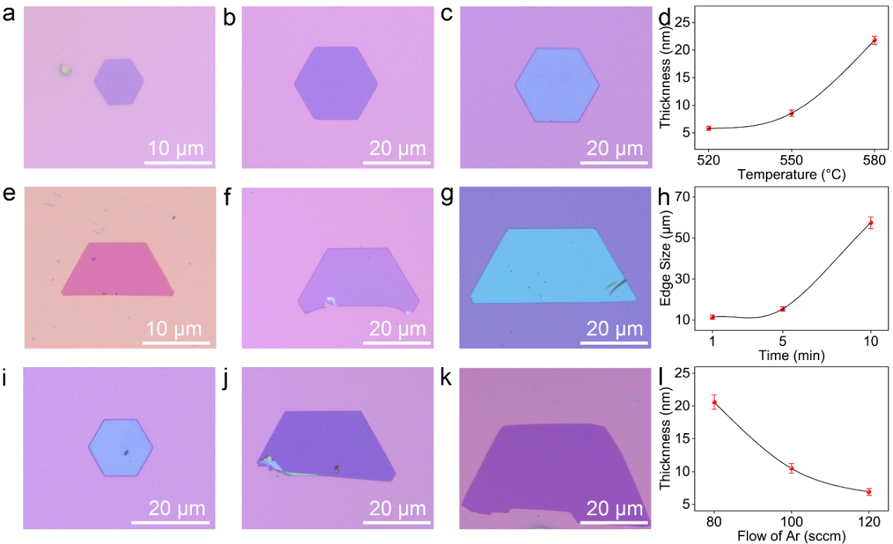 图2. 二维V3S5可控生长。(a-c)V3S5光学形貌分别生长于520 ˚C(a),550 ˚C(b)和580 ˚C(c)。(d)不同生长温度下V3S5平均厚度分布。(e-g)V3S5在不同生长时间分别生长于1 min(e)、5 min(f)和10 min(g)光学形貌。(h)二维V3S5平均尺寸与生长时间的关系。(i-k)V3S5在不同氩气流速下生长的光学形貌分别生长于80 sccm(i)、100 sccm(j)和120 sccm(k)。(l)V3S5平均厚度与Ar流速的关系。