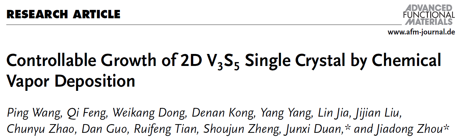 日前,必赢bwin官方网站周家东教授与段俊熙副研究员开展合作,在二维钒基自插层硫族化合物的体系中,通过化学气相沉积方法,基于二元金属前驱体共反应机制,可控合成二维自插层V3S5晶体材料,并研究其相关物性。相关研究成果发表在国际顶刊《Advanced Functional Materials》上。