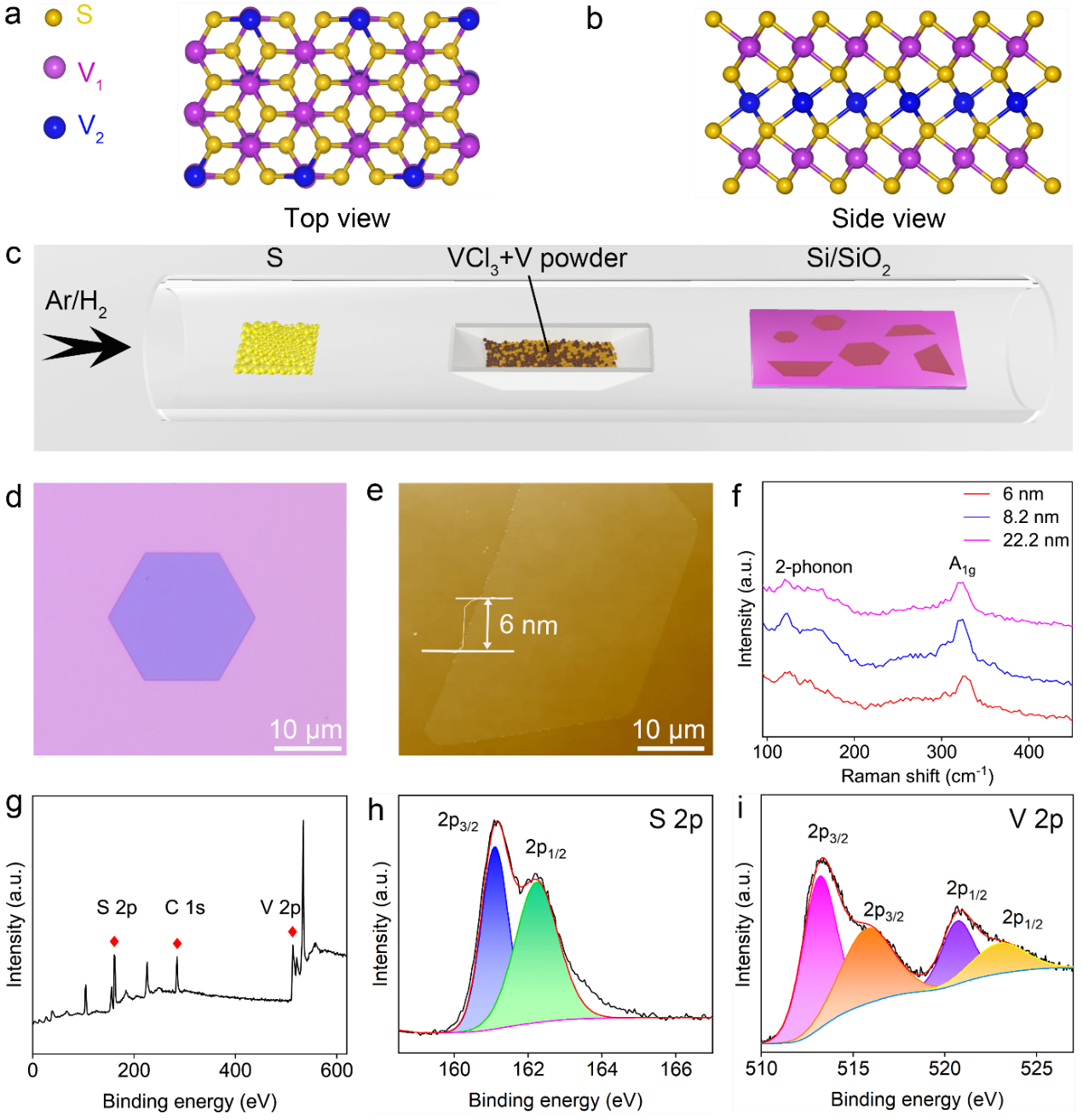 图1. V3S5晶体的合成和表征。(a,b)V3S5 的原子结构。(c)二维V3S5晶体合成机制。(d)二维V3S5的光学形貌。(e)V3S5的AFM图。(f)V3S5厚度相关拉曼光谱。(g)二维V3S5 XPS光谱;(h,i)分别为 S 2p 和 V 2p 对应的 XPS 光谱。