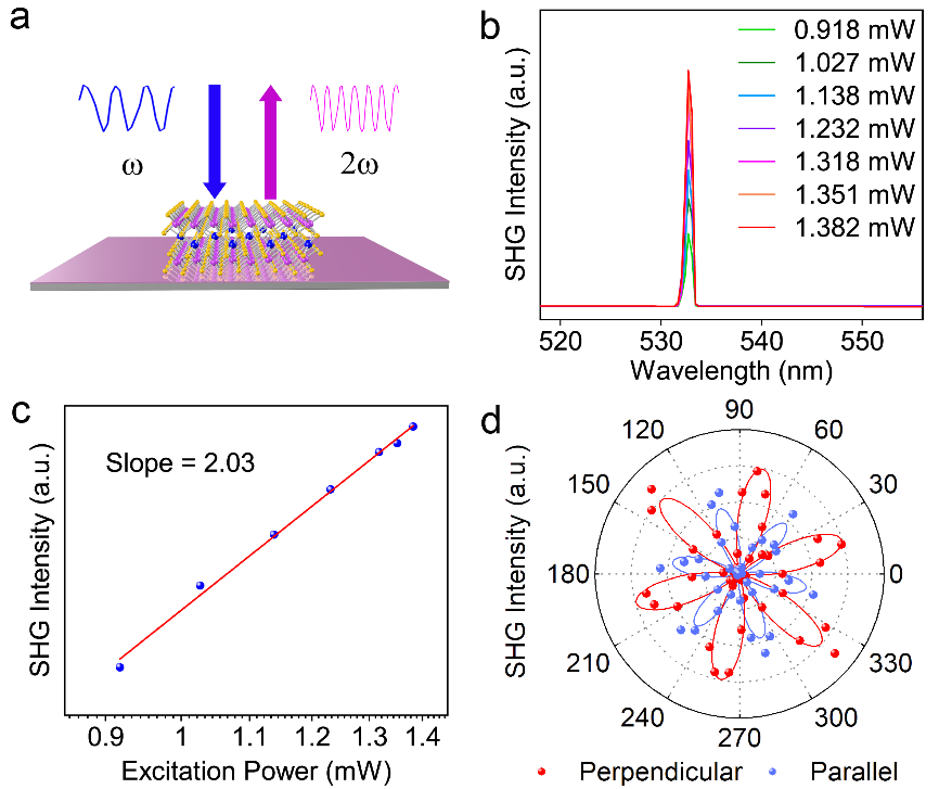 图3. 在1064 nm激光下V3S5的SHG信号。(a) SHG测试示意图。(b) 激光功率和SHG强度的关系;(c)二次非线性系数拟合图;(d)SHG强度分别沿V3S5平行和垂直方向的偏振角变化关系。