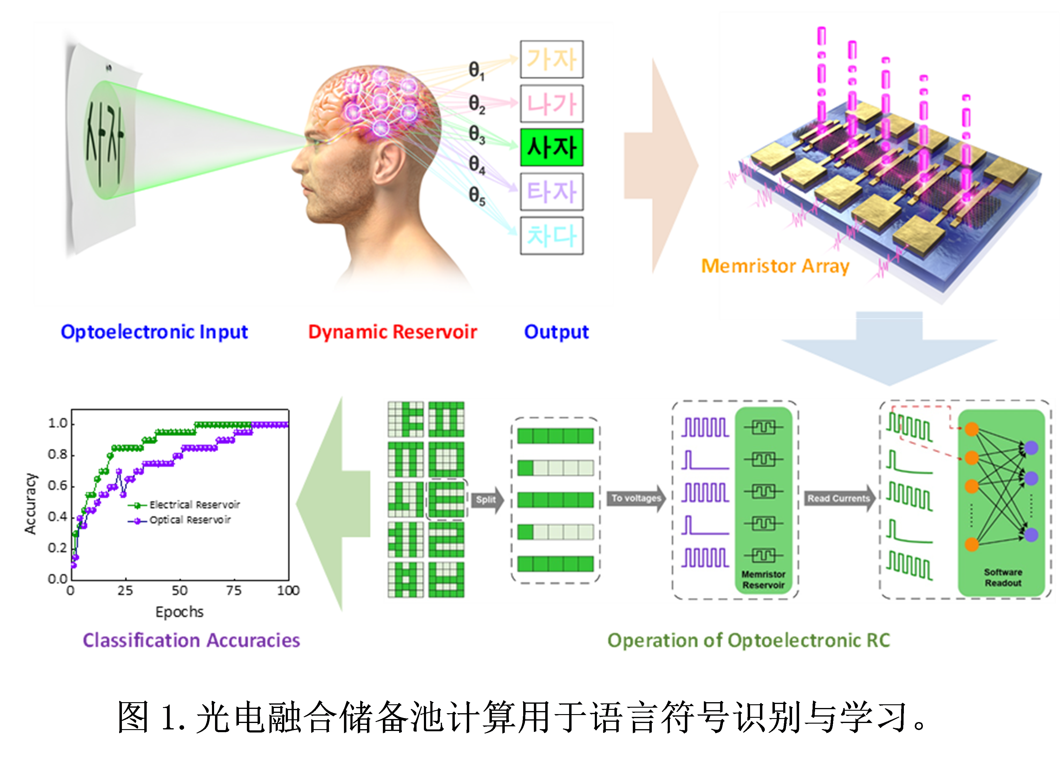 日前,必赢bwin官方网站姚裕贵教授团队孙林锋教授与韩国高等科学技术研究院Heejun Yang教授,香港大学Wang Zhongrui教授合作,提出了一种基于低维材料体系的新型多维度光电融合忆阻器件,实现了传感器内储备池计算,并成功用在语言符号识别与学习上。在考虑相似度极高的干扰项存在的前提下,对复杂的语言句子体系实现了91%的识别率。该项成果为机器学习和边缘计算应用提供了一种处理时序信号事件的低成本训练方案。此项工作于五月十四日发表在《Science》子刊 Science Advances上。