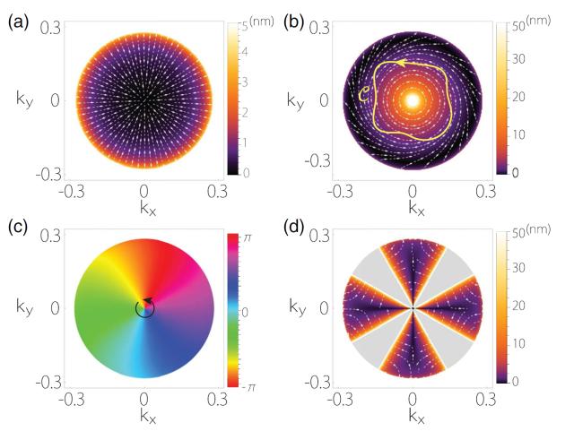 余智明等人首先通过对称性分析,指出当入射区域具有某些特定的对称性,反常位移的环流必然是量子化的。特别重要的是,该量子化的对称性要求其实并不苛刻。许多实验上的常规体系,如普通金属,即满足上述量子化的对称性要求。其后该工作计算了两个具体的模型:普通金属和外尔半金属模型、以及普通金属和超导体模型的反常位移。计算结果显示反常位移的矢量场在界面动量空间中会形成量子漩涡,直接证明反常位移环流具有量子化的特性,如图2和图3所示。此外计算也表明量子化环流的值取决于外尔点和超导体的拓扑电荷。
