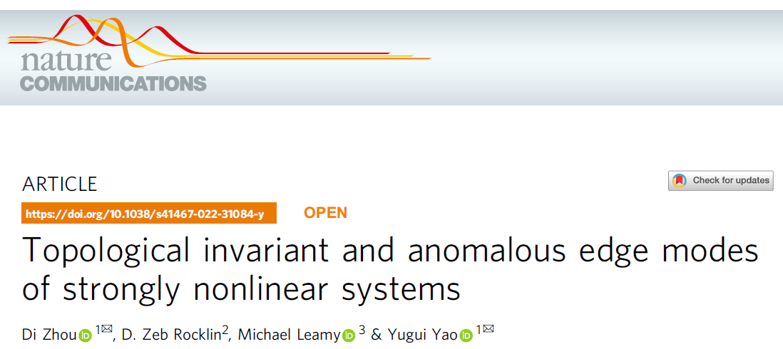 近日,必赢bwin官方网站姚裕贵教授、周迪研究员团队,在《Nature Communications》发表题为 “Topological invariant and anomalous edge modes of strongly nonlinear systems” 的文章。团队通过数学推导,研究了广义强非线性系统,在非线性波中提出贝里相位的合理定义,并严格证明其量子化条件。作者通过理论计算和数值模拟,验证了非线性拓扑模的稳定性,将 “体边对应关系”推广到广义强非线性系统中。必赢bwin官方网站周迪研究员为论文的第一作者,周迪研究员和姚裕贵教授为论文的共同通讯作者。论文的合作者包括佐治亚理工大学的D. Zeb Rocklin教授和Michael J. Leamy教授。
