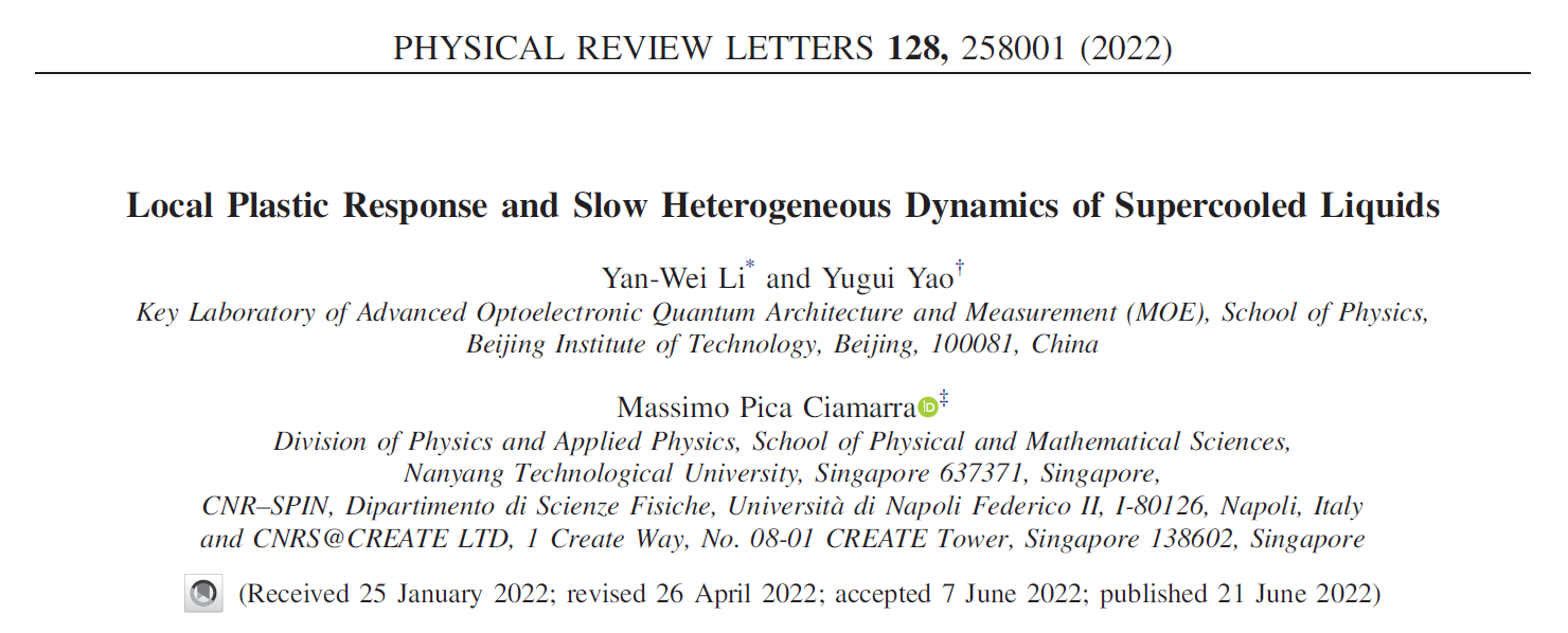 相关工作发表在Physical Review Letters上,必赢bwin官方网站李艳伟研究员为第一作者兼通讯作者,必赢bwin官方网站姚裕贵教授和新加坡南洋理工大学Massimo Pica Ciamarra为论文共同通讯作者。该工作第一单位为必赢bwin官方网站,并得到国家自然科学基金、必赢bwin官方网站青年学者学术启动计划等项目的支持。