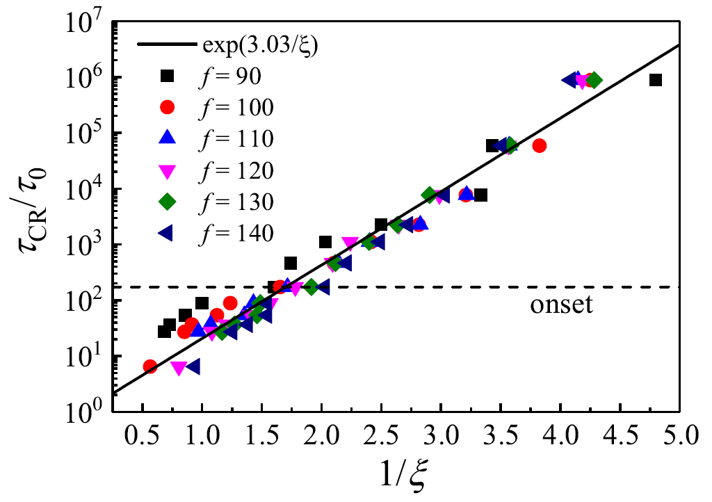 团队设计了新的探测玻璃体系静态结构的手段,具体为,在短时间内,对粒子施加一固定大小,方向随机选取的力,观察撤去力之后,粒子不能回弹的位移,即不可逆位移有多大。图1(a)展示了当对粒子在0.1(约化单位)时间间隔内施加一外力大小为f = 100(约化单位)的力时,粒子平均位移随时间的演化规律。较长时间下,此平均位移趋近一平台值,即黑色虚线标出的不可逆位移L(T, f),显然,温度越低,不可逆位移L(T, f)越小。近一步的研究发现,L(T, f)正比于T - T0 (图1 (b)),其中T0为Vogel–Fulcher–Tammann (VFT) 方程预测的非晶体系的理想玻璃化转变点,因此,L(T, f)在理想玻璃化转变点外推为0。进一步分离变量,我们可得到L(T, f) = ξ(T)A(f), 其中塑性长度ξ(T)∝(T - T0 ), A(f) ∝(f - f0)。塑性长度ξ(T)与体系弛豫时间存在指数依赖关系(图2),因此建立了塑性长度与非晶体系慢动力学的联系。