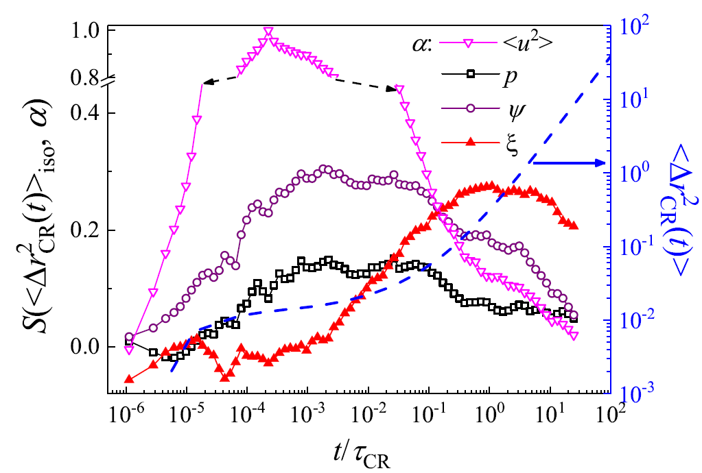 为了探索塑性长度与体系动力学异质性之间的关联,计算了每个粒子的同构型(iso-configurational ensemble)系综下的平均均方位移<∆r2CR(t)>iso,并通过Spearman等级相关系数定量表征了动力学参数<∆r2CR(t)>iso与静态参数的关联。为了对比,静态参数除了我们提出的塑性长度外,还包含三个常见的通过弹性性质定义的量,包括Debye-Waller因子<u2>,其简谐近似下的均方位移ψ,以及低频振动模的参与分数p。结果表明,弹性性质的相关量仅在较小的振动尺度与动力学存在关联,而塑性长度在弛豫时间或更长时间尺度与动力学存在关联 (图3)。这展现出塑性长度可能是与体系弛豫行为更相关的一个静态量。为玻璃化转变结构与动力学关联问题探索了一个新思路。