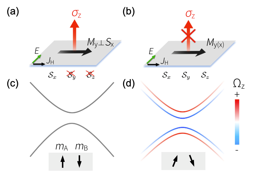 图1: 在PT对称的反铁磁系统中产生面内反常霍尔效应的示意图。