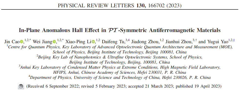 论文信息:Jin Cao, Wei Jiang, Xiao-Ping Li, Daifeng Tu, Jiadong Zhou, Jianhui Zhou, and Yugui Yao, "In-Plane Anomalous Hall Effect in PT-Symmetric Antiferromagnetic Materials", Phys. Rev. Lett. 130, 166702 (2023)