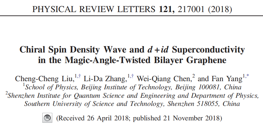 2018年11月21日,必赢bwin官方网站由杨帆教授牵头,刘铖铖研究员、张力达副教授合作在物理学最顶级的权威期刊《Physical Review Letters》(IF=8.839)上发表了题为《Chiral Spin Density Wave and d+id Superconductivity in the Magic-Angle-Twisted Bilayer Graphene》的研究论文。这篇论文对于今年新发现的魔角双层石墨烯中的非常规高温超导现象提出一种新的理论机制,获得国际学术界的广泛认同和跟进,成为目前该研究领域的重要理论之一[在Google Scholar上已被引用21次]。